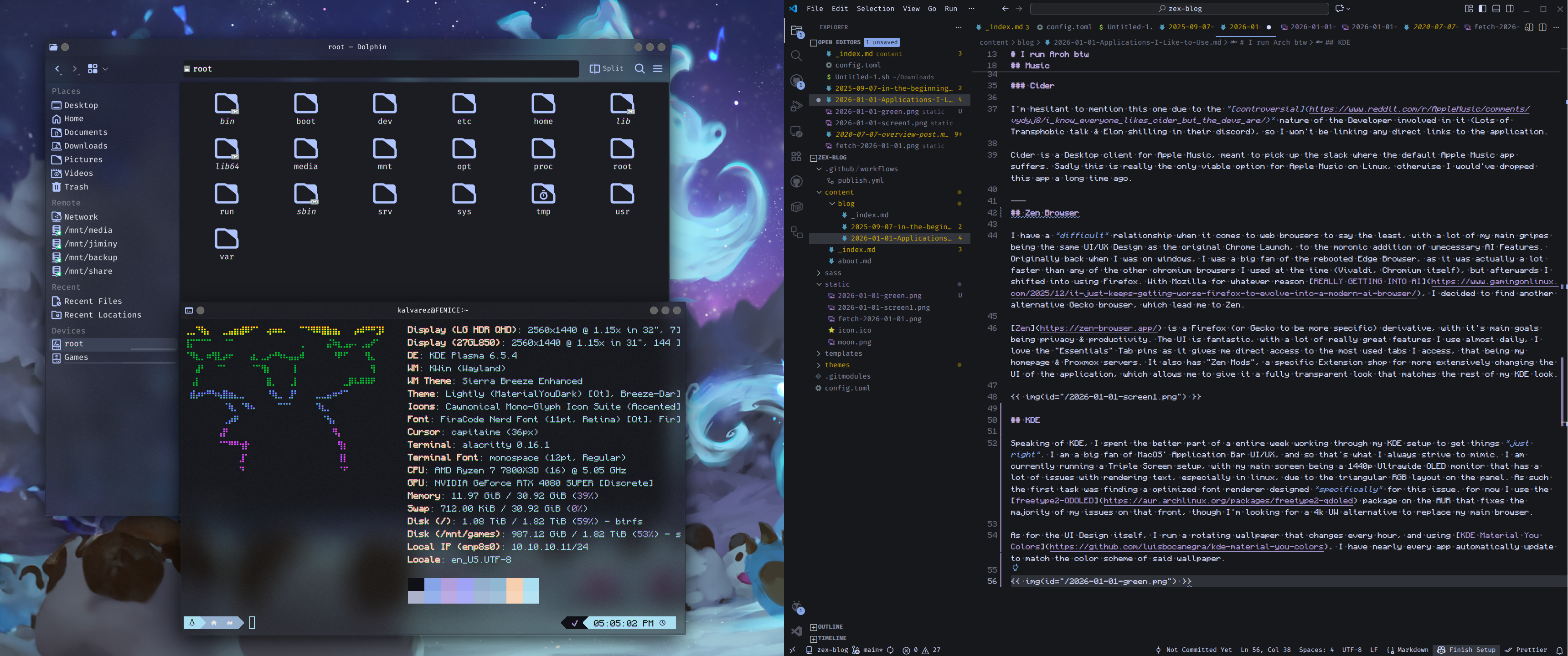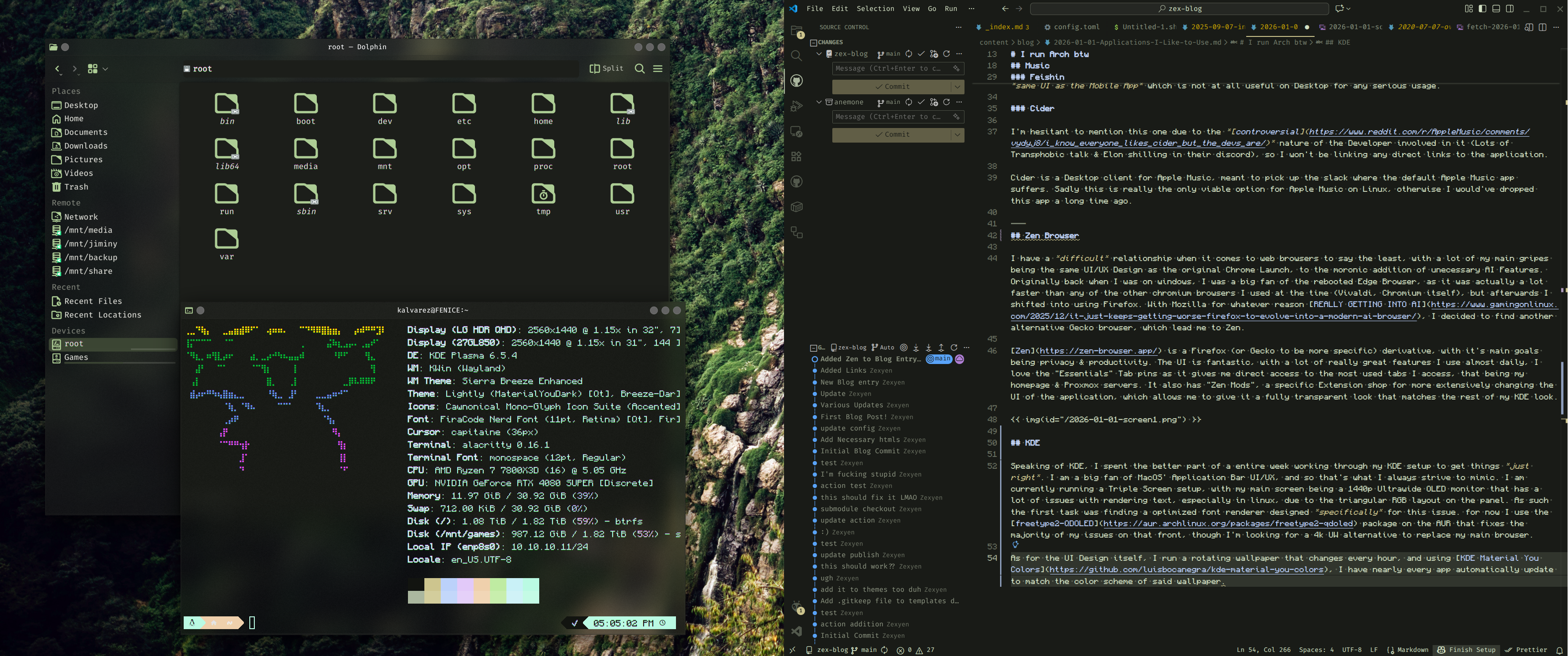 As for the UI Design itself, I run a rotating wallpaper that changes every hour, and using KDE Material You Colors, I have nearly every app automatically update to match the color scheme of said wallpaper. to Achieve the blur effect, I use better blur DX