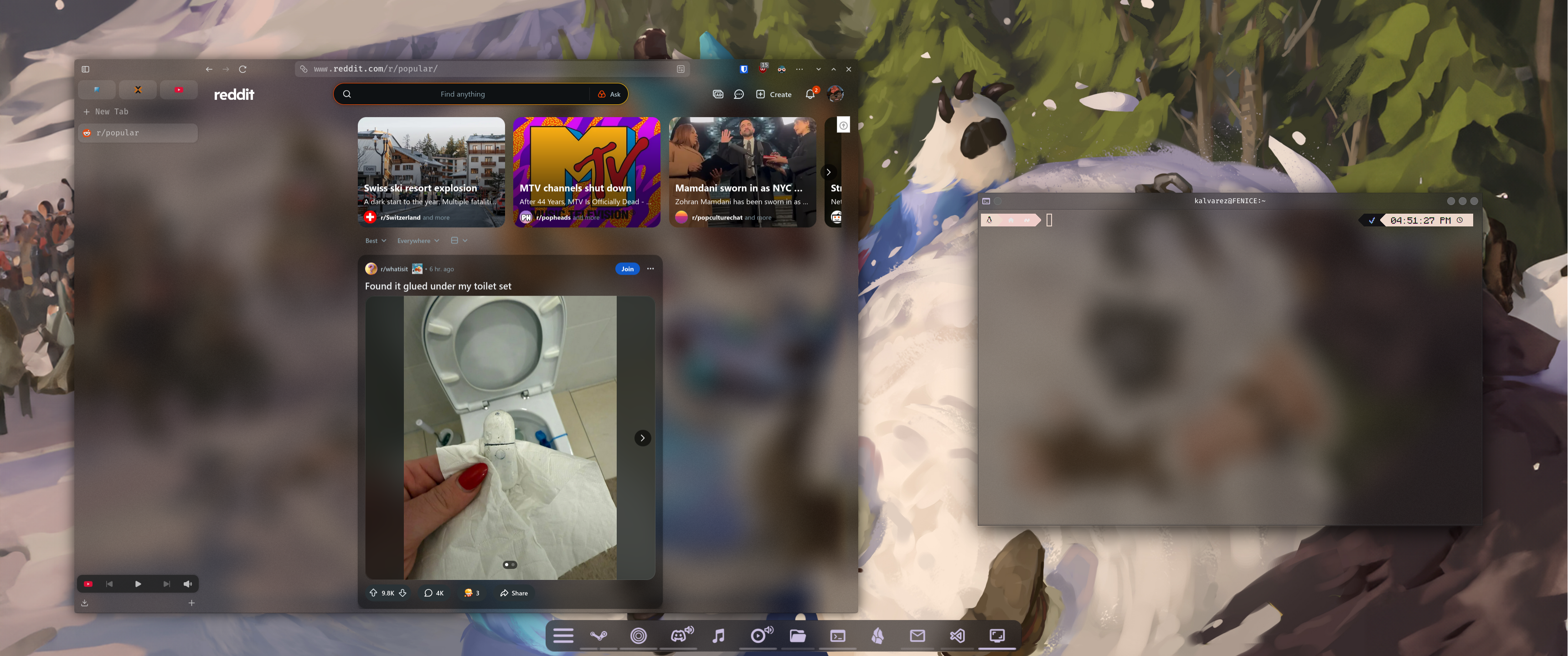 Zen is a Firefox (or Gecko to be more specific) derivative, with itās main goals being privacy & productivity. The UI is fantastic, with a lot of really great features I use almost daily, I love the āEssentialsā Tab pins as it gives me direct access to the most used tabs I access, that being my homepage & Proxmox servers. It also has āZen Modsā, a specific Extension shop for more extensively changing the UI of the application, which allows me to give it a fully transparent look that matches the rest of my KDE look.